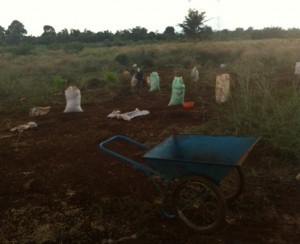 It was so beautiful. The coffee parchment replicated a checkerboard on the drying flats, 2.5 centimeters thick. The furrows were perfectly aligned and glistening gold in the hot Laotian sunlight. 25 tons of coffee parchment—what is left after the cherry pulp is removed—were spread like a shimmering, undulating carpet across 2.5 acres of drying flats. What a sight!